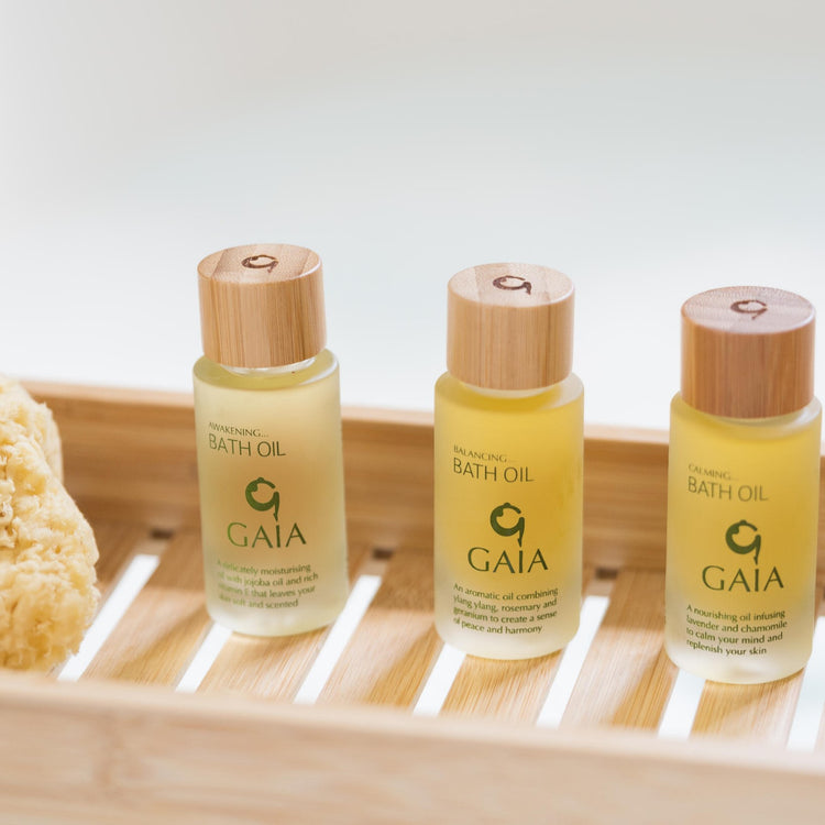THREE NOURISHING BATH OILS IN THE AWAKENING, BALANCING AND CALMING BELNDS FOR A SOOTHING BATH EXPERIENCE.