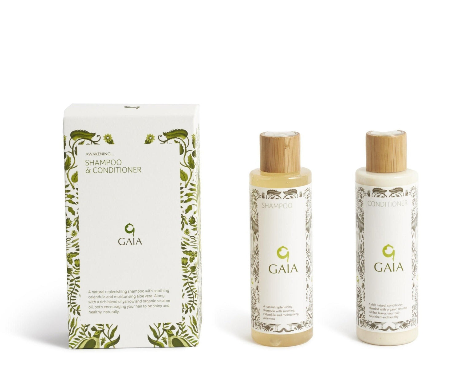 Cleanse and nourish with our Shampoo and Conditioner set. Our shampoo contains moisturising aloe vera, soothing calendula and replenishing yarrow. Follow with our creamy conditioner with added glycerine, organic sesame oil and yarrow, both encouraging your hair to be shiny and healthy, naturally. Presented in a GAIA gift box.